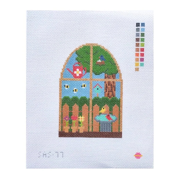 This is a hand painted needlepoint canvas from Saturnalia Stitching. It features a painting of a window frame which has birds, fountains, and more in view.
