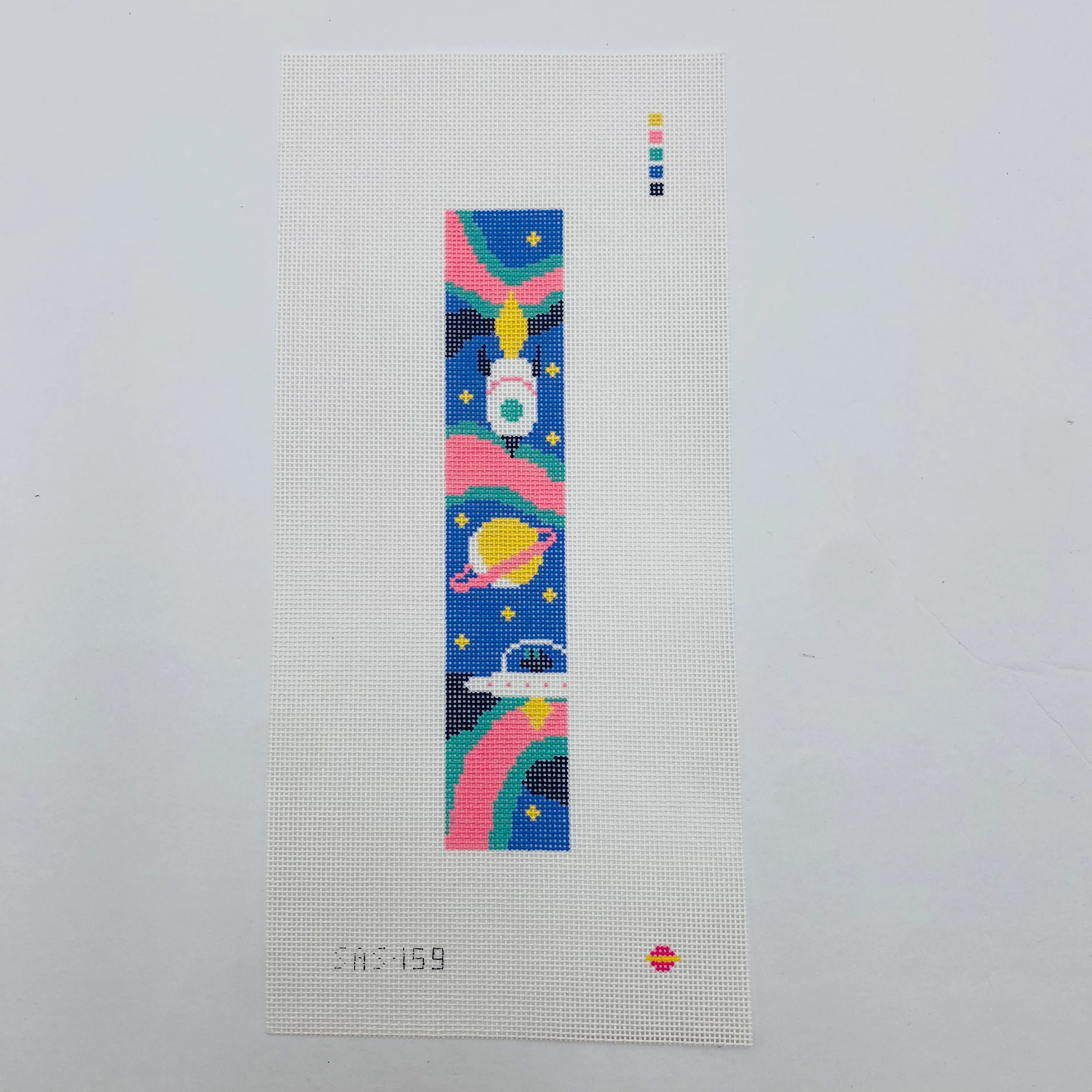 This is a hand painted needlepoint canvas from Saturnalia Stitching. It features a painting of a space ship with a cute intergalactic pattern in the background. This canvas is intended to be finished as a key fob or a bookmark.