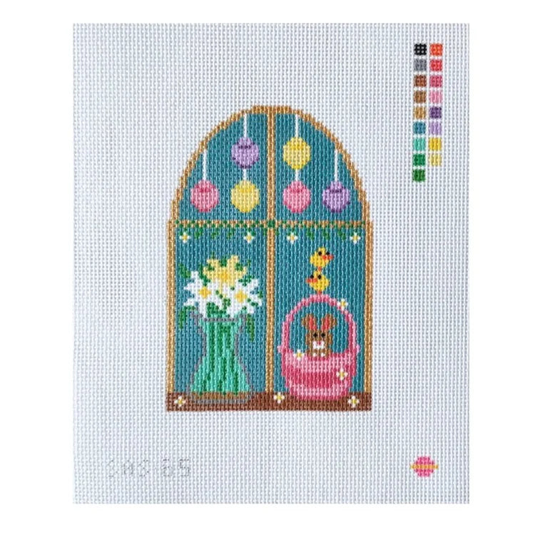 This is a hand painted needlepoint canvas from Saturnalia Stitching. It features a painting of a window frame which has an assortment of Easter items in view.