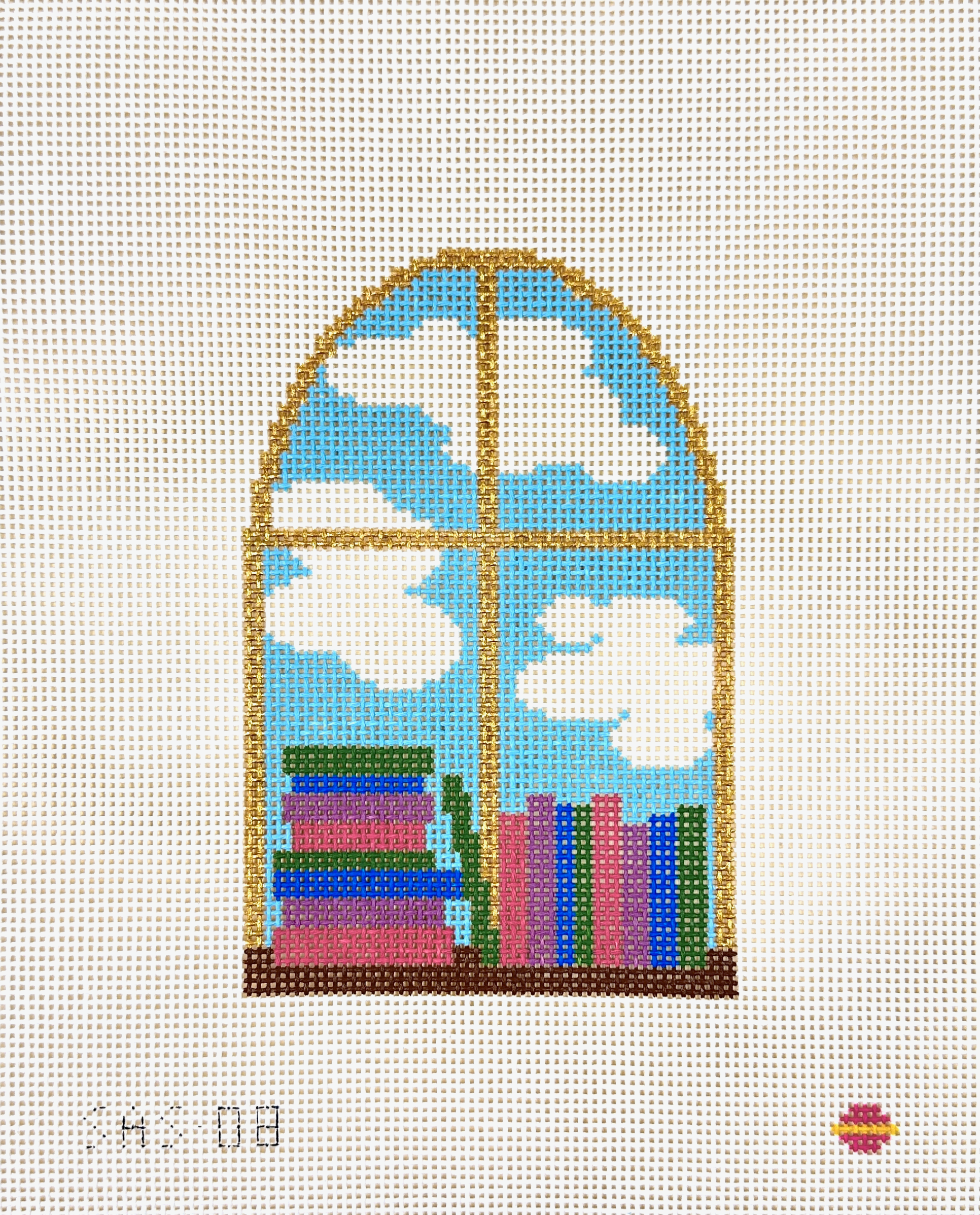 This is a hand painted needlepoint canvas from Saturnalia Stitching. It features a painting of a window frame which has some books set on the sill and clouds in the distance.