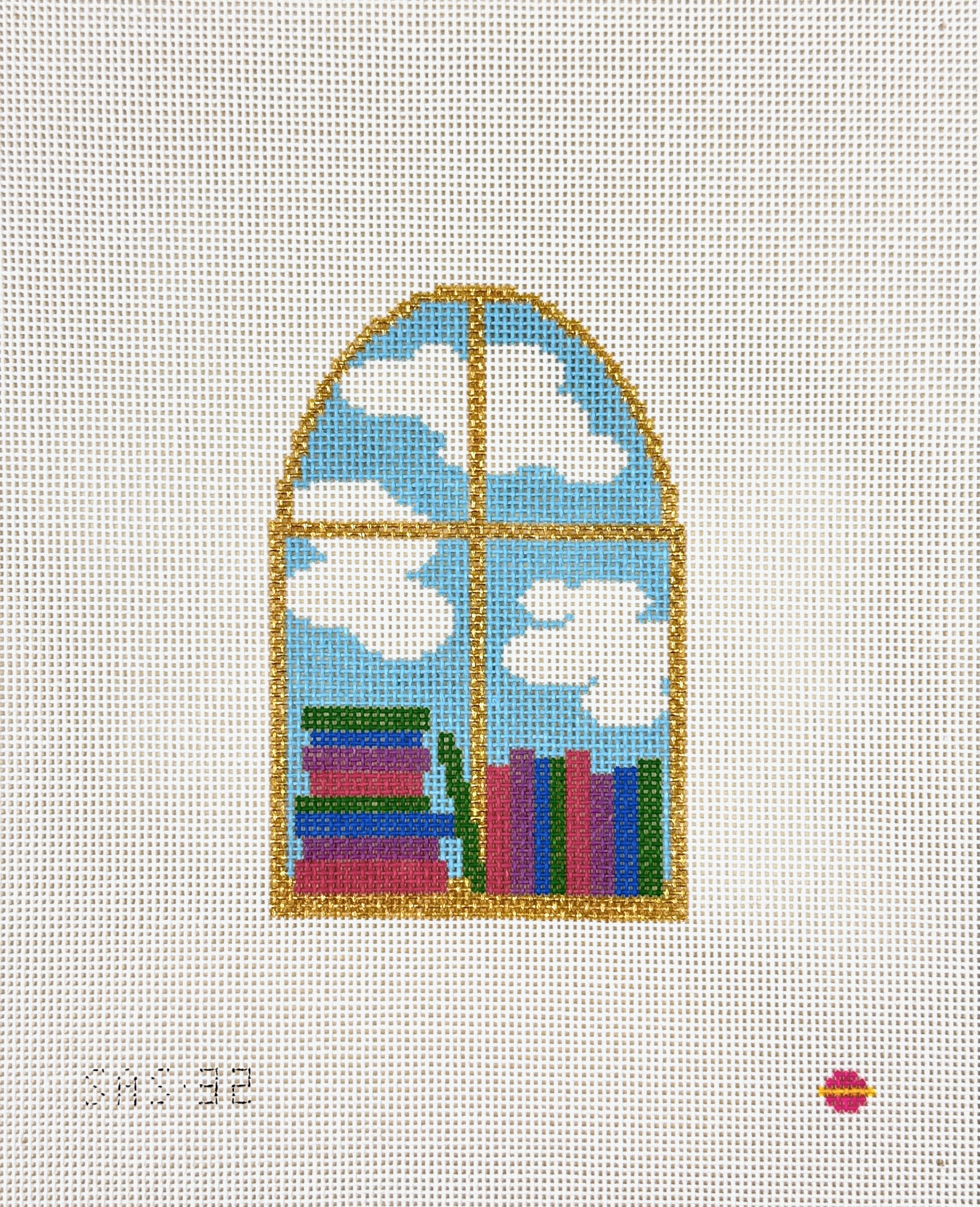 This is a hand painted needlepoint canvas from Saturnalia Stitching. It features a painting of a window frame which has some books set on the sill and a cloudy sky in the distance.