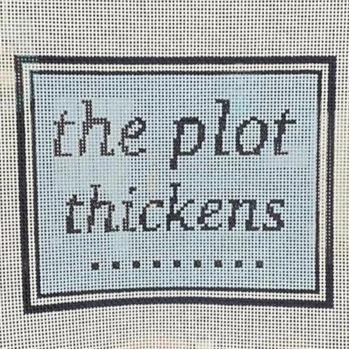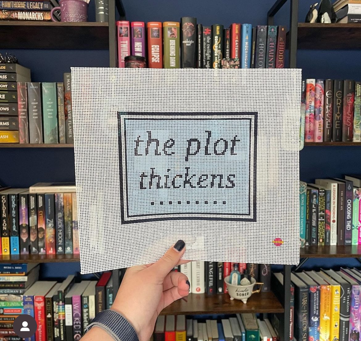 This hand painted needlepoint canvas from Saturnalia Stitching features a sign stating "The Plot Thickens".