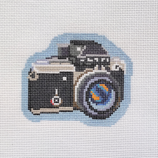 This hand painted needlepoint canvas from Saturnalia Stitching features a classic SLR film camera.