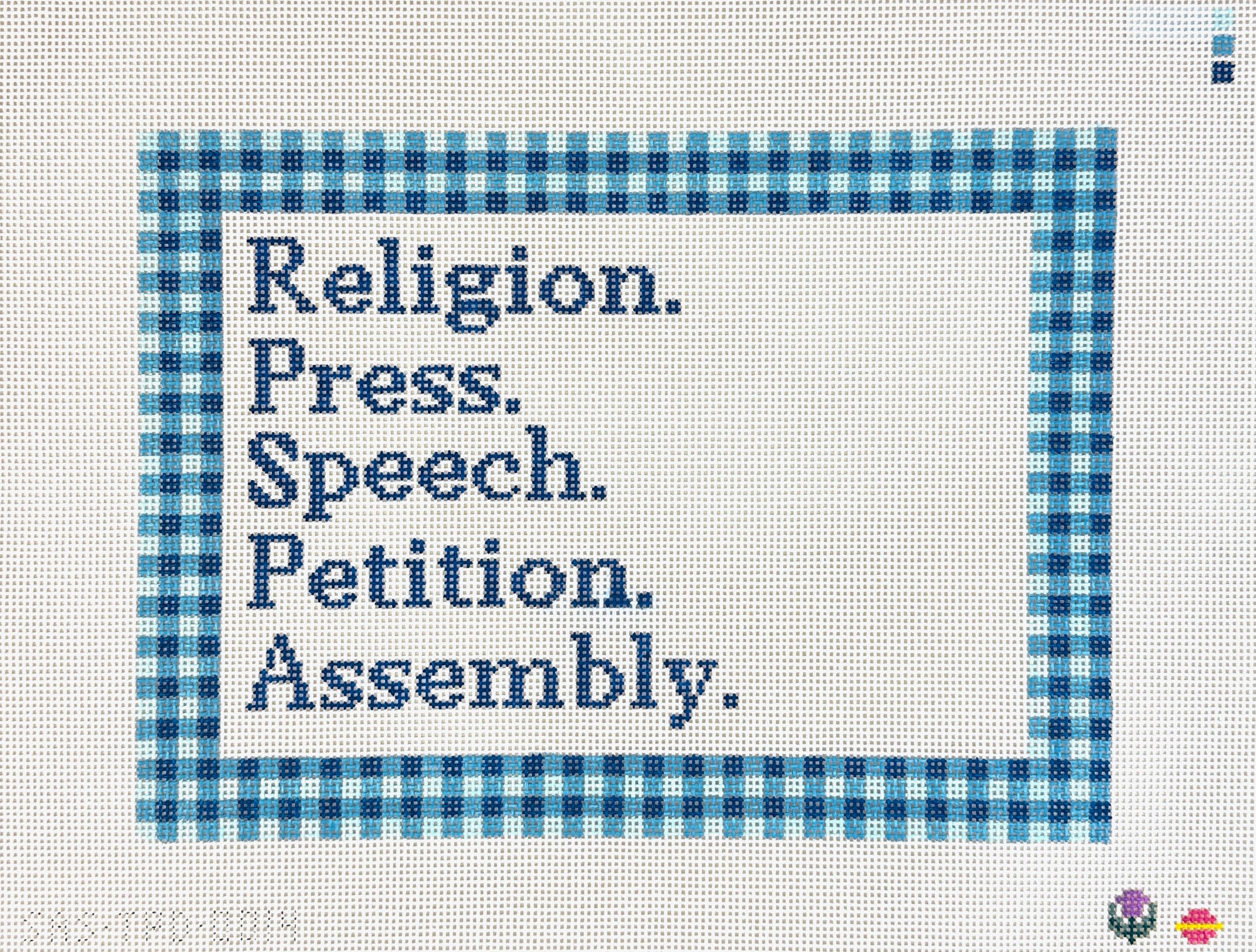 This is a hand-painted needlepoint canvas by Thistle Pine Designs from Saturnalia Stitching. It features a plaid sign, with some of the topics protected by free speech inside.