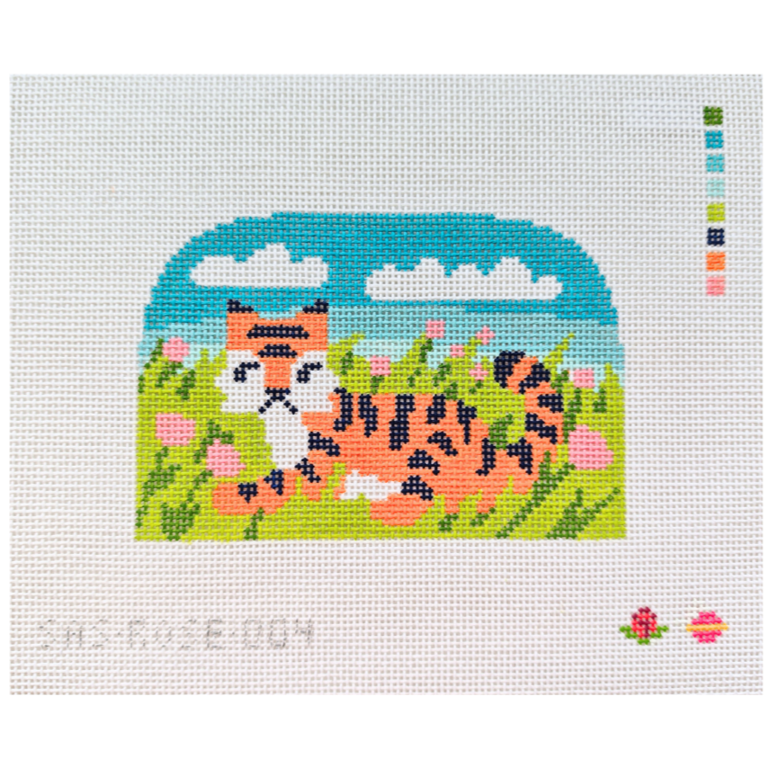 This printed needlepoint canvas by Rose Acolyte features a tiger prancing amongst a field of flowers.