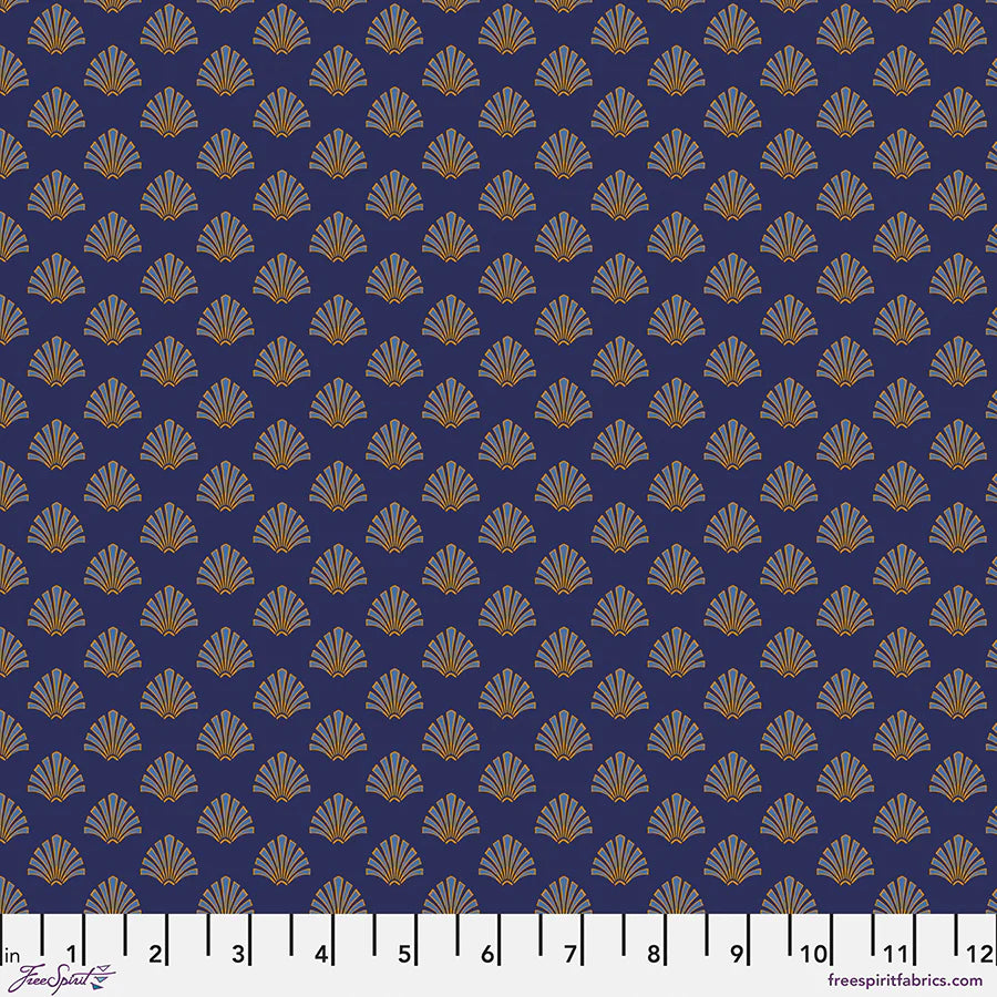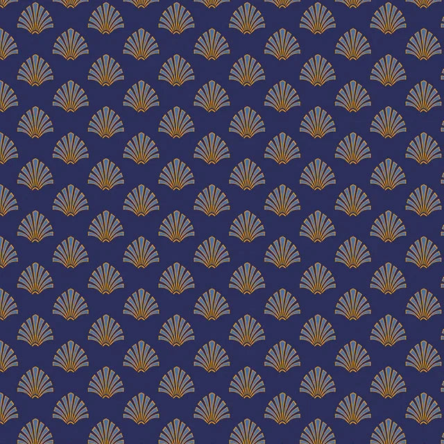 This medium weight cotton fabric by Sew Kind of Wonderful features an elegant Art Deco inspired design on a navy blue background.