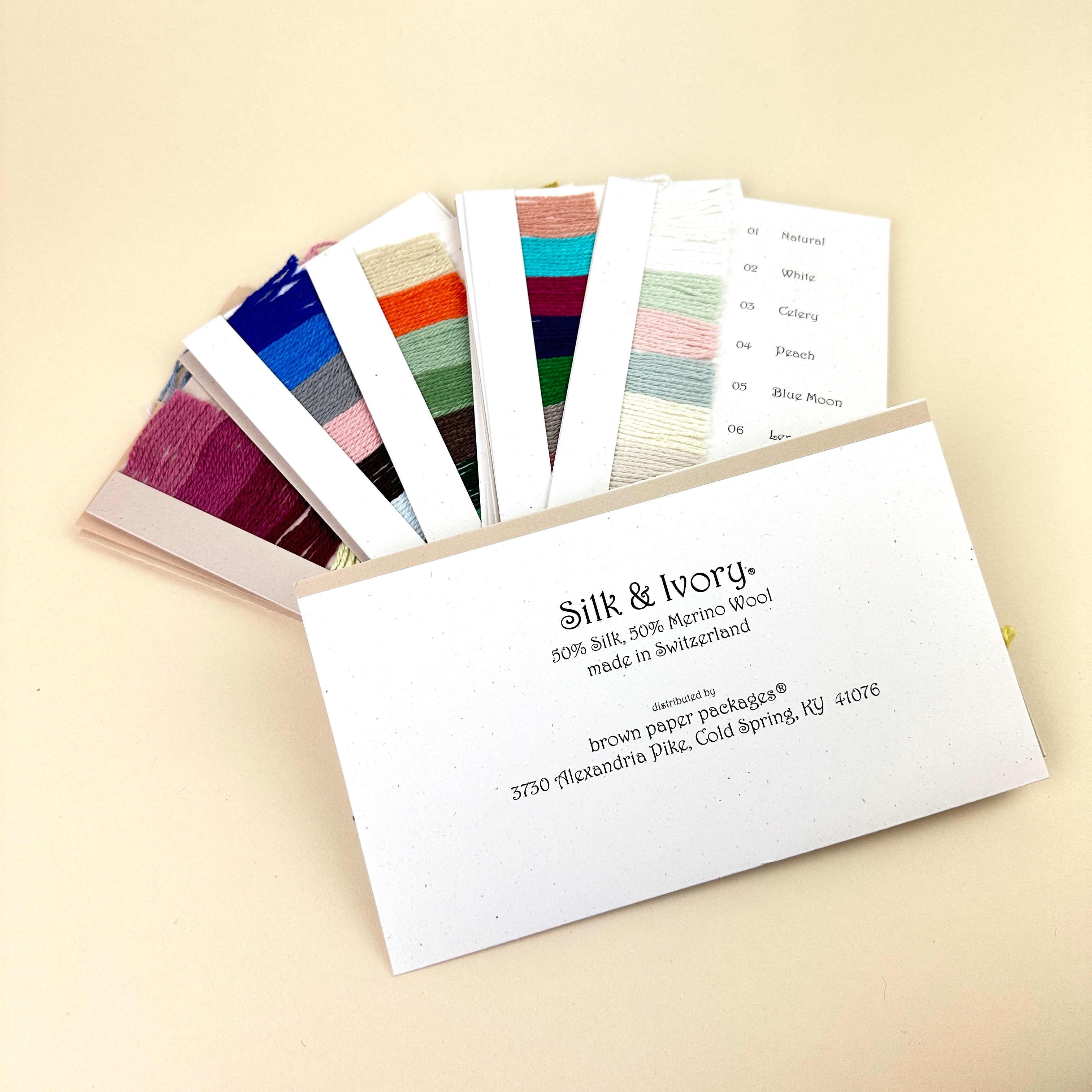 If you live in a needlepoint desert, or your local shop doesn't carry Silk & Ivory, a color card can be an valuable tool to help with color selection. Of course, dye lots do have some variation, but you'll get a much truer idea of the color from a color card vs your monitor. This color card features 250 colors of actual thread on cards. The cards are not bound together, so they can be laid out for an easy overview. Each card holds about 10 colors