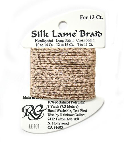 This is Silk Lame Braid 13 from Rainbow Gallery in color 101 Honey Bronze. A great thread for adding sparkle to 13 mesh projects. Use as-is on 13 mesh.