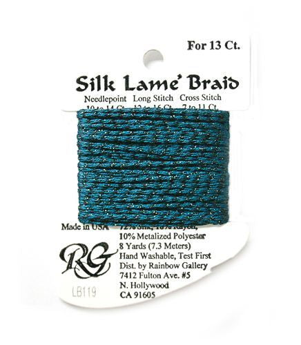 This is Silk Lame Braid 13 from Rainbow Gallery in color 119 Blue Sapphire. A great thread for adding sparkle to 13 mesh projects. Use as-is on 13 mesh.