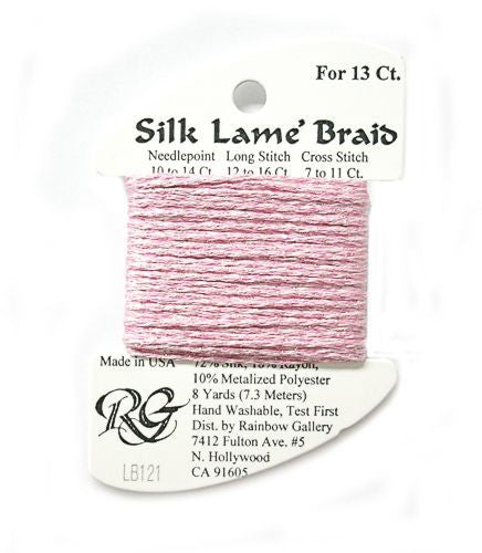 This is Silk Lame Braid 13 from Rainbow Gallery in color 121 Medium Raspberry. A great thread for adding sparkle to 13 mesh projects. Use as-is on 13 mesh.