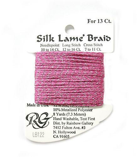 This is Silk Lame Braid 13 from Rainbow Gallery in color 122 Hot Pink. A great thread for adding sparkle to 13 mesh projects. Use as-is on 13 mesh.
