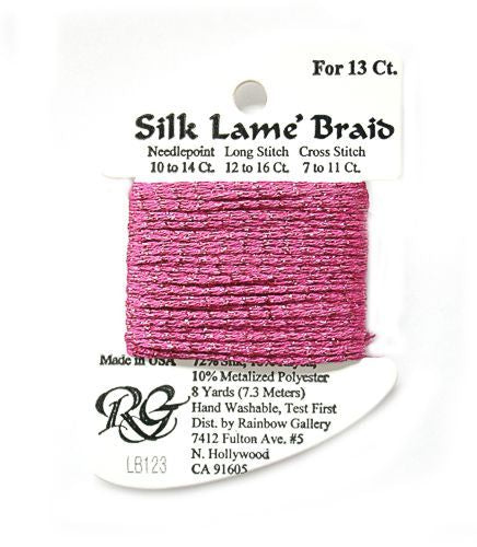 This is Silk Lame Braid 13 from Rainbow Gallery in color 123 Dark Hot Pink. A great thread for adding sparkle to 13 mesh projects. Use as-is on 13 mesh.