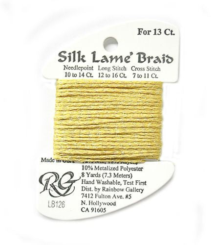 This is Silk Lame Braid 13 from Rainbow Gallery in color 126 Canary Yellow. A great thread for adding sparkle to 13 mesh projects. Use as-is on 13 mesh.