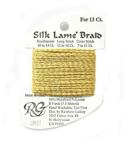This is Silk Lame Braid 13 from Rainbow Gallery in color 127 Golden Yarrow. A great thread for adding sparkle to 13 mesh projects. Use as-is on 13 mesh.