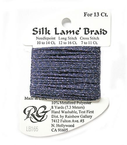 This is Silk Lame Braid 13 from Rainbow Gallery in color 165 Dark Wisteria. A great thread for adding sparkle to 13 mesh projects. Use as-is on 13 mesh.