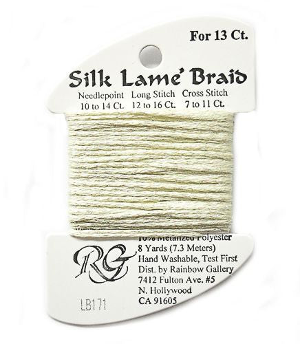 This is Silk Lame Braid 13 from Rainbow Gallery in color 171 Mellow Yellow. A great thread for adding sparkle to 13 mesh projects. Use as-is on 13 mesh.