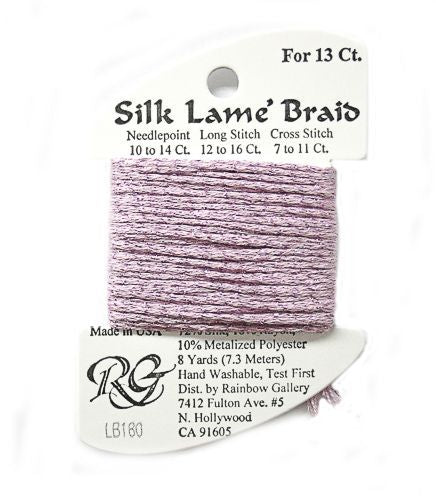 This is Silk Lame Braid 13 from Rainbow Gallery in color 180 Lilac Chiffon. A great thread for adding sparkle to 13 mesh projects. Use as-is on 13 mesh.
