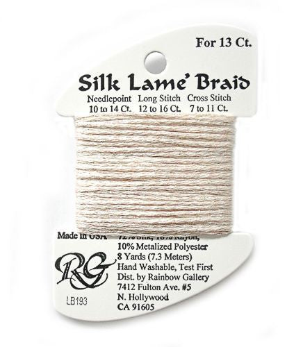 This is Silk Lame Braid 13 from Rainbow Gallery in color 193 Creme Brulee. A great thread for adding sparkle to 13 mesh projects. Use as-is on 13 mesh.