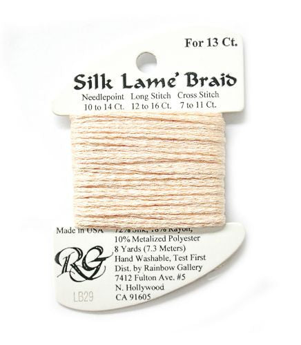 This is Silk Lame Braid 13 from Rainbow Gallery in color 029 Chiffon. A great thread for adding sparkle to 13 mesh projects. Use as-is on 13 mesh.