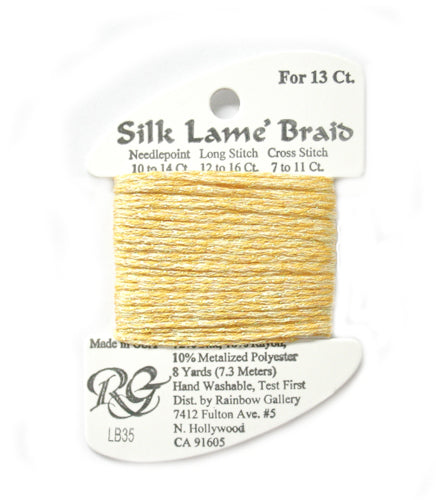This is Silk Lame Braid 13 from Rainbow Gallery in color 035 Yellow. A great thread for adding sparkle to 13 mesh projects. Use as-is on 13 mesh.
