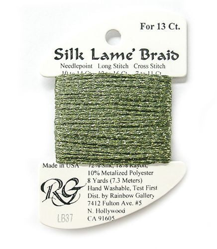 This is Silk Lame Braid 13 from Rainbow Gallery in color 037 Dark Avocado. A great thread for adding sparkle to 13 mesh projects. Use as-is on 13 mesh.