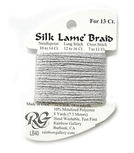 This is Silk Lame Braid 13 from Rainbow Gallery in color 040 Dove Gray. A great thread for adding sparkle to 13 mesh projects. Use as-is on 13 mesh.