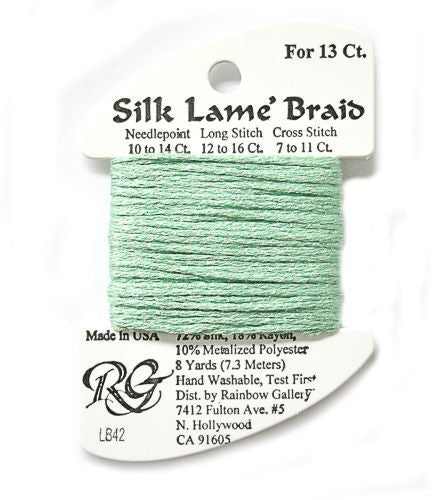 This is Silk Lame Braid 13 from Rainbow Gallery in color 042 Mint. A great thread for adding sparkle to 13 mesh projects. Use as-is on 13 mesh.