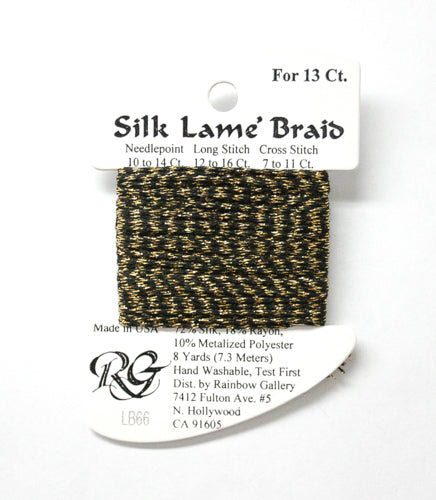 This is Silk Lame Braid 13 from Rainbow Gallery in color 066 Antique Gold. A great thread for adding sparkle to 13 mesh projects. Use as-is on 13 mesh.