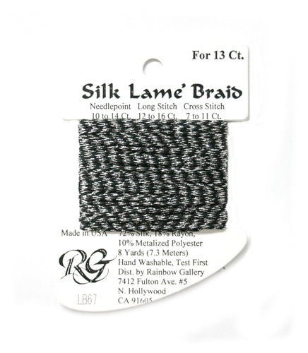 This is Silk Lame Braid 13 from Rainbow Gallery in color 067 Antique Silver. A great thread for adding sparkle to 13 mesh projects. Use as-is on 13 mesh.