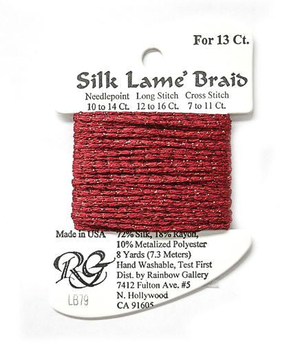 This is Silk Lame Braid 13 from Rainbow Gallery in color 079 Dark Cherry. A great thread for adding sparkle to 13 mesh projects. Use as-is on 13 mesh.