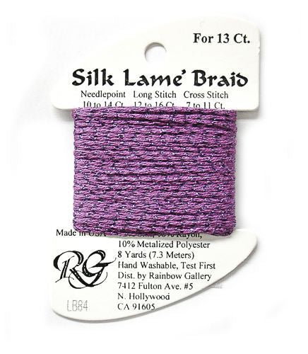 This is Silk Lame Braid 13 from Rainbow Gallery in color 084 Dark Orchid. A great thread for adding sparkle to 13 mesh projects. Use as-is on 13 mesh.