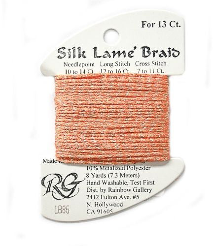 This is Silk Lame Braid 13 from Rainbow Gallery in color 085 Tangerine. A great thread for adding sparkle to 13 mesh projects. Use as-is on 13 mesh.