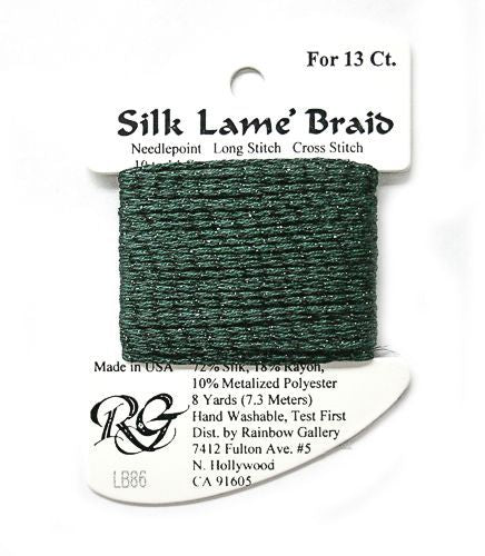 This is Silk Lame Braid 13 from Rainbow Gallery in color 086 Deep Forest Green. A great thread for adding sparkle to 13 mesh projects. Use as-is on 13 mesh.