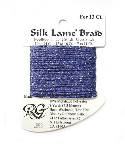 This is Silk Lame Braid 13 from Rainbow Gallery in color 093 Dark Periwinkl. A great thread for adding sparkle to 13 mesh projects. Use as-is on 13 mesh.
