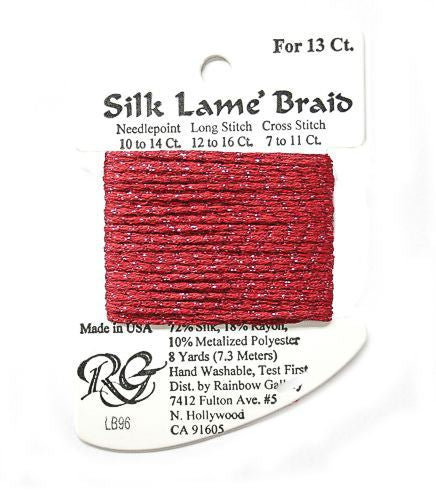 This is Silk Lame Braid 13 from Rainbow Gallery in color 096 Cranberry. A great thread for adding sparkle to 13 mesh projects. Use as-is on 13 mesh.