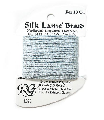 This is Silk Lame Braid 13 from Rainbow Gallery in color 098 Pale Antique Blue. A great thread for adding sparkle to 13 mesh projects. Use as-is on 13 mesh.