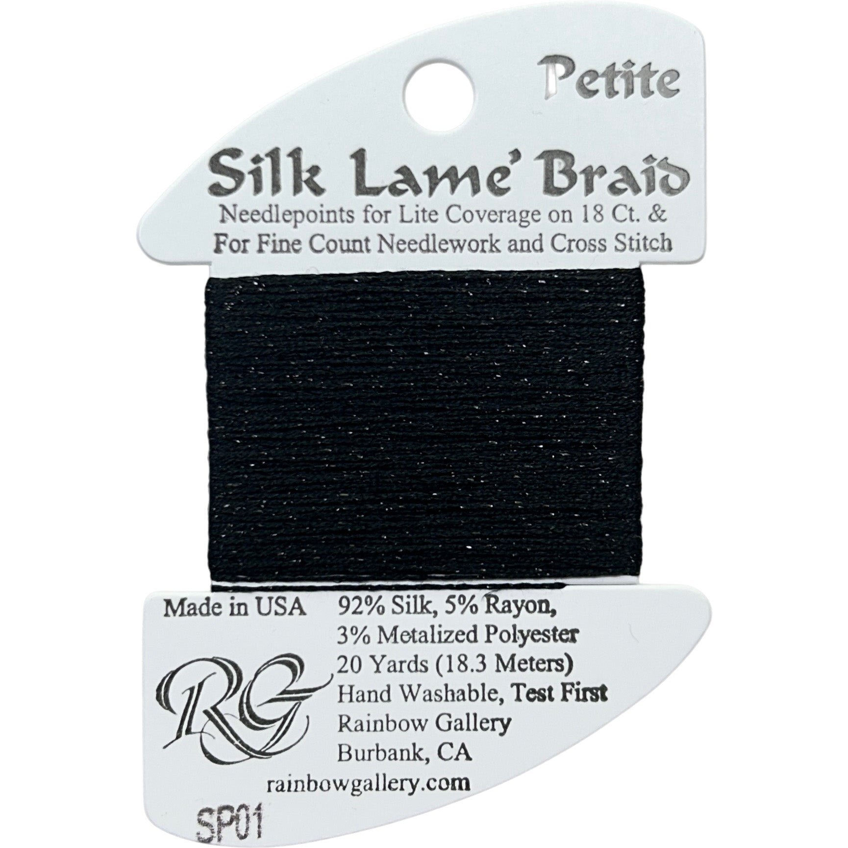 This is Silk Lame Braid Petite from Rainbow Gallery in color 001 Black. Use on 18 mesh for light coverage, or with a floss as a blending filament. 2 strands of Silk Lame Braid Petite are approximately equivalent to one strand of Silk Lame Braid 18.