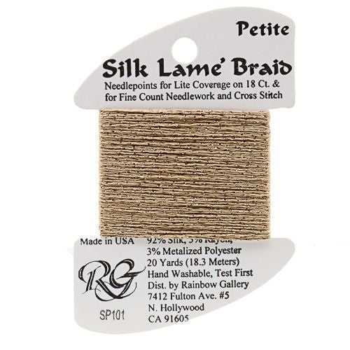 This is Silk Lame Braid Petite from Rainbow Gallery in color 101 Honey Brown. Use on 18 mesh for light coverage, or with a floss as a blending filament. 2 strands of Silk Lame Braid Petite are approximately equivalent to one strand of Silk Lame Braid 18.