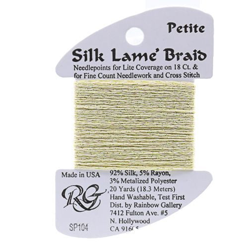 This is Silk Lame Braid Petite from Rainbow Gallery in color 104 Soft Yellow. Use on 18 mesh for light coverage, or with a floss as a blending filament. 2 strands of Silk Lame Braid Petite are approximately equivalent to one strand of Silk Lame Braid 18.