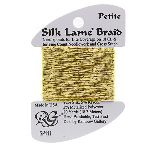 This is Silk Lame Braid Petite from Rainbow Gallery in color 111 Chardonnay. Use on 18 mesh for light coverage, or with a floss as a blending filament. 2 strands of Silk Lame Braid Petite are approximately equivalent to one strand of Silk Lame Braid 18.
