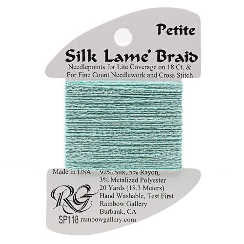 This is Silk Lame Braid Petite from Rainbow Gallery in color 118 Sea Spray. Use on 18 mesh for light coverage, or with a floss as a blending filament. 2 strands of Silk Lame Braid Petite are approximately equivalent to one strand of Silk Lame Braid 18.