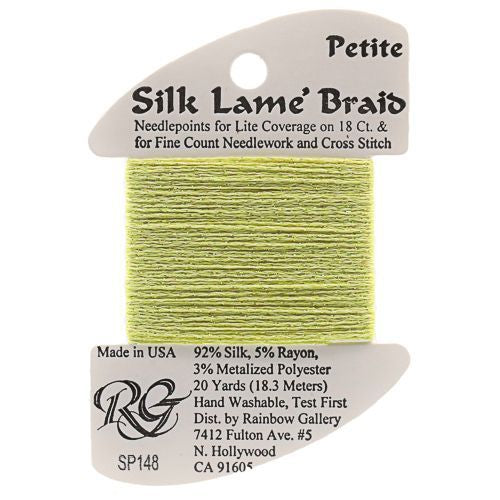 This is Silk Lame Braid Petite from Rainbow Gallery in color 148 Lemon Lime. Use on 18 mesh for light coverage, or with a floss as a blending filament. 2 strands of Silk Lame Braid Petite are approximately equivalent to one strand of Silk Lame Braid 18.
