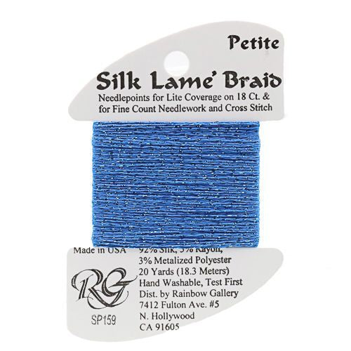 This is Silk Lame Braid Petite from Rainbow Gallery in color 159 Imperial Blue. Use on 18 mesh for light coverage, or with a floss as a blending filament. 2 strands of Silk Lame Braid Petite are approximately equivalent to one strand of Silk Lame Braid 18.