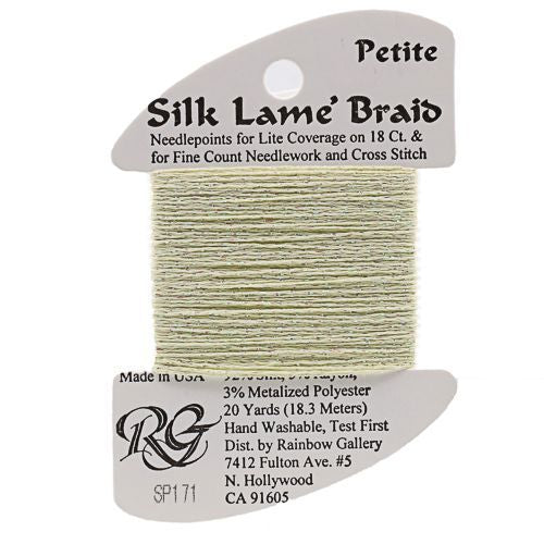 This is Silk Lame Braid Petite from Rainbow Gallery in color 171 Mellow Yellow. Use on 18 mesh for light coverage, or with a floss as a blending filament. 2 strands of Silk Lame Braid Petite are approximately equivalent to one strand of Silk Lame Braid 18.