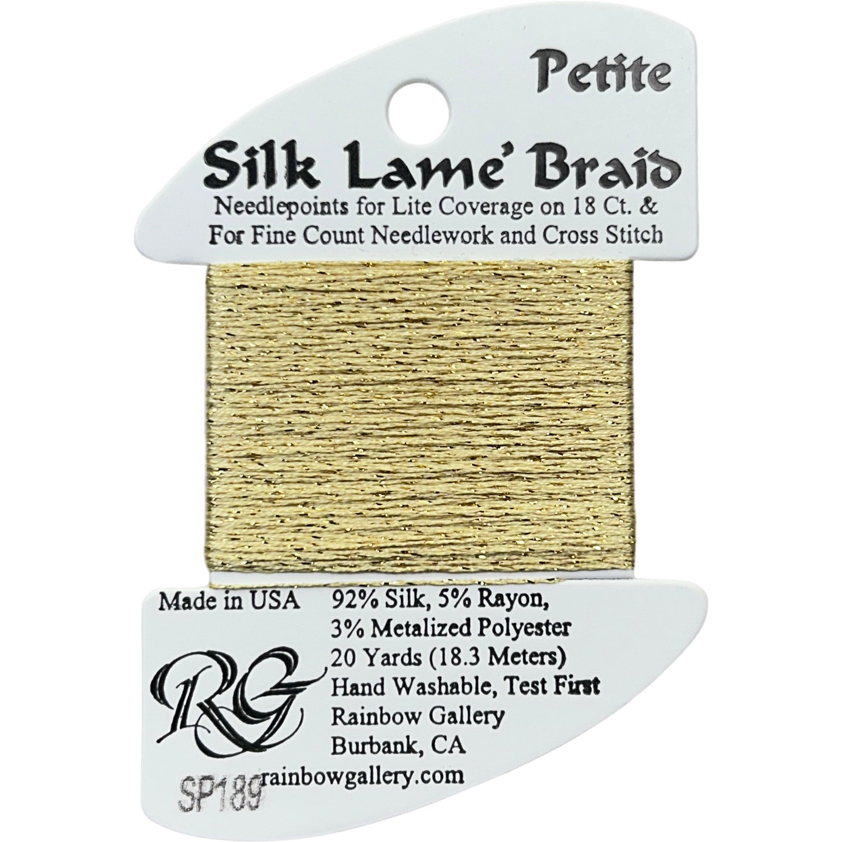 This is Silk Lame Braid Petite from Rainbow Gallery in color 189 Banana Crepe. Use on 18 mesh for light coverage, or with a floss as a blending filament. 2 strands of Silk Lame Braid Petite are approximately equivalent to one strand of Silk Lame Braid 18.