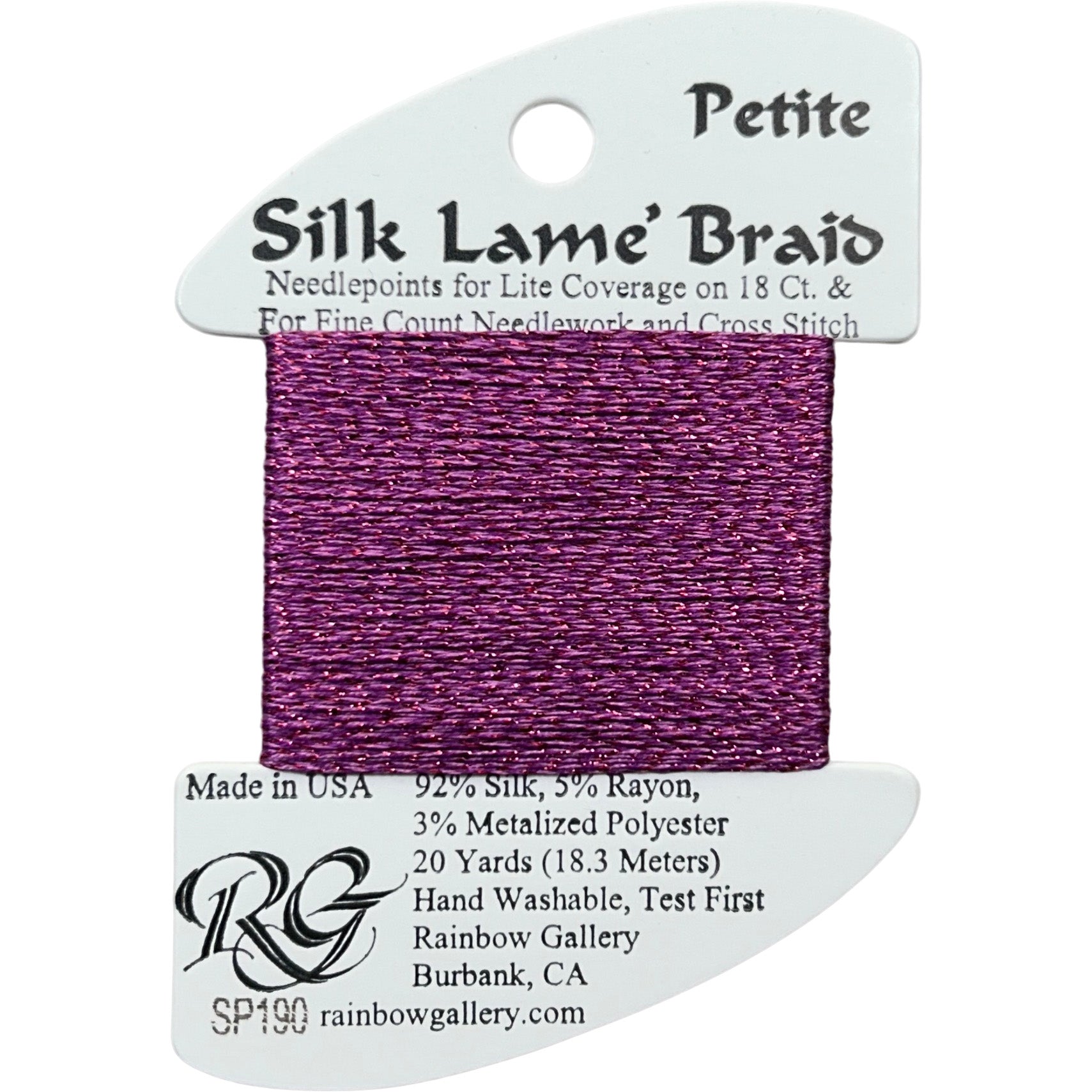 This is Silk Lame Braid Petite from Rainbow Gallery in color 190 Purple Orchid. Use on 18 mesh for light coverage, or with a floss as a blending filament. 2 strands of Silk Lame Braid Petite are approximately equivalent to one strand of Silk Lame Braid 18.