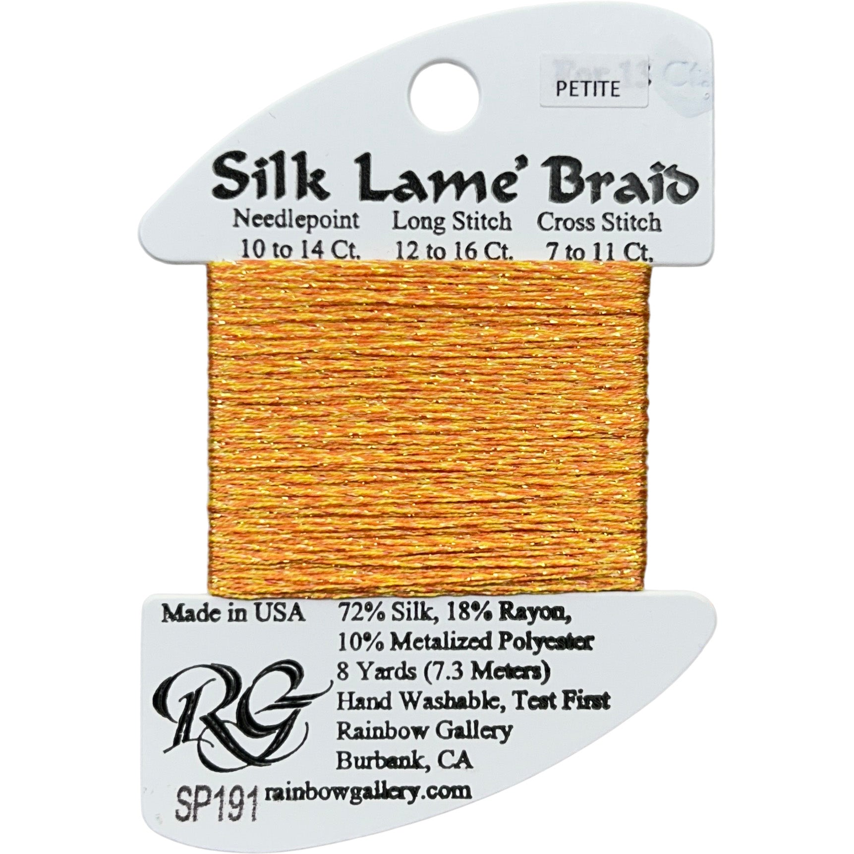 This is Silk Lame Braid Petite from Rainbow Gallery in color 191 Goldenrod. Use on 18 mesh for light coverage, or with a floss as a blending filament. 2 strands of Silk Lame Braid Petite are approximately equivalent to one strand of Silk Lame Braid 18.