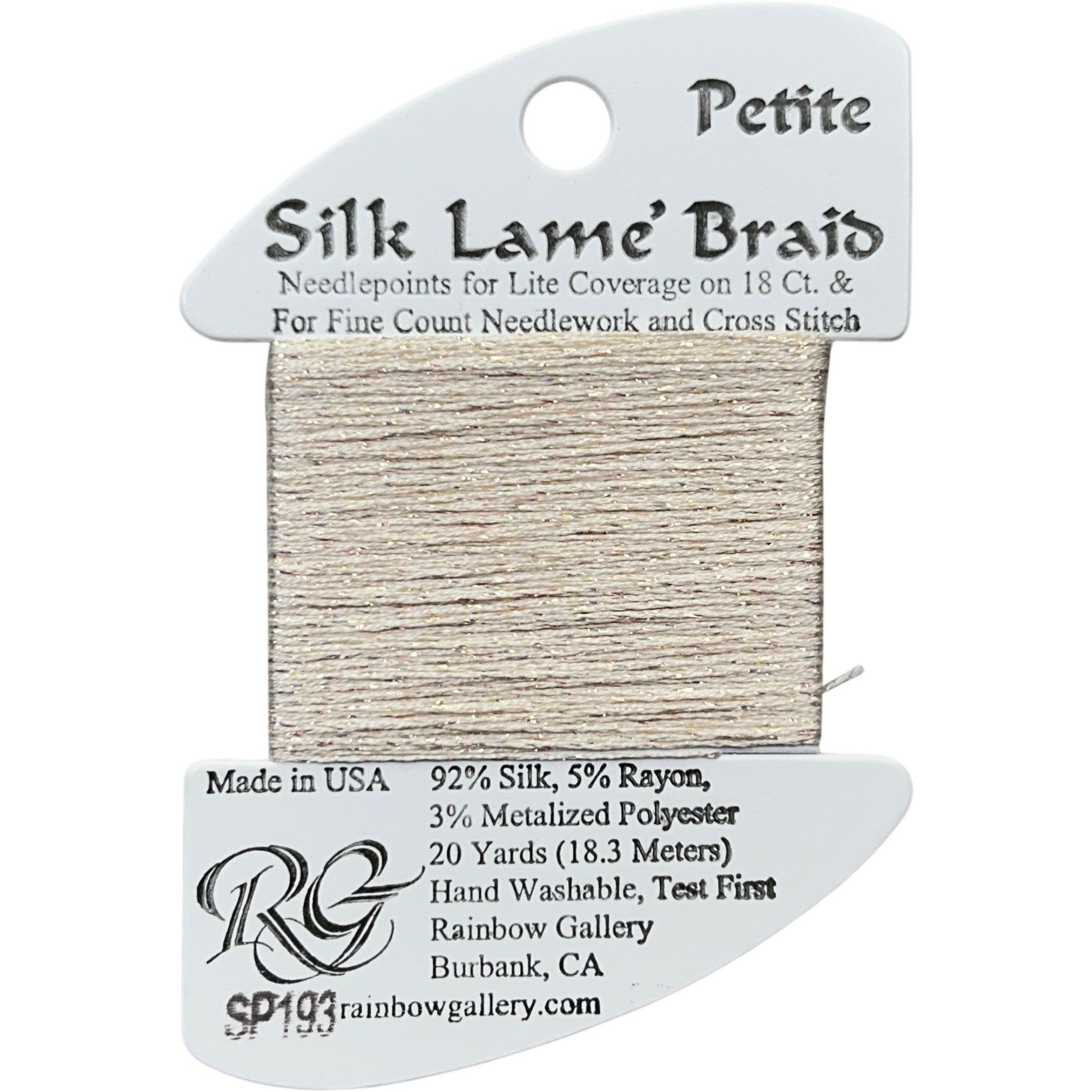 This is Silk Lame Braid Petite from Rainbow Gallery in color 193 Creme Brulee. Use on 18 mesh for light coverage, or with a floss as a blending filament. 2 strands of Silk Lame Braid Petite are approximately equivalent to one strand of Silk Lame Braid 18.