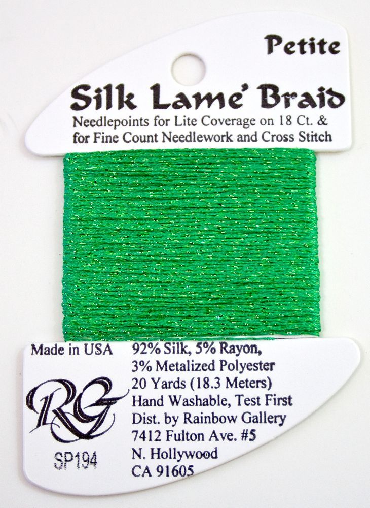 This is Silk Lame Braid Petite from Rainbow Gallery in color 194 Greenbriar. Use on 18 mesh for light coverage, or with a floss as a blending filament. 2 strands of Silk Lame Braid Petite are approximately equivalent to one strand of Silk Lame Braid 18.