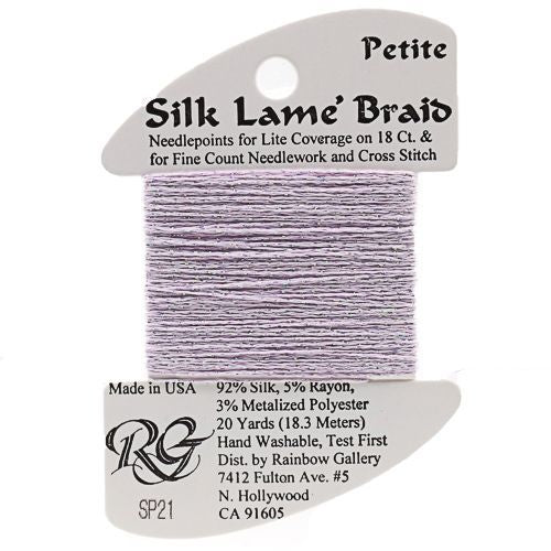 This is Silk Lame Braid Petite from Rainbow Gallery in color 021 Light Lavender. Use on 18 mesh for light coverage, or with a floss as a blending filament. 2 strands of Silk Lame Braid Petite are approximately equivalent to one strand of Silk Lame Braid 18.